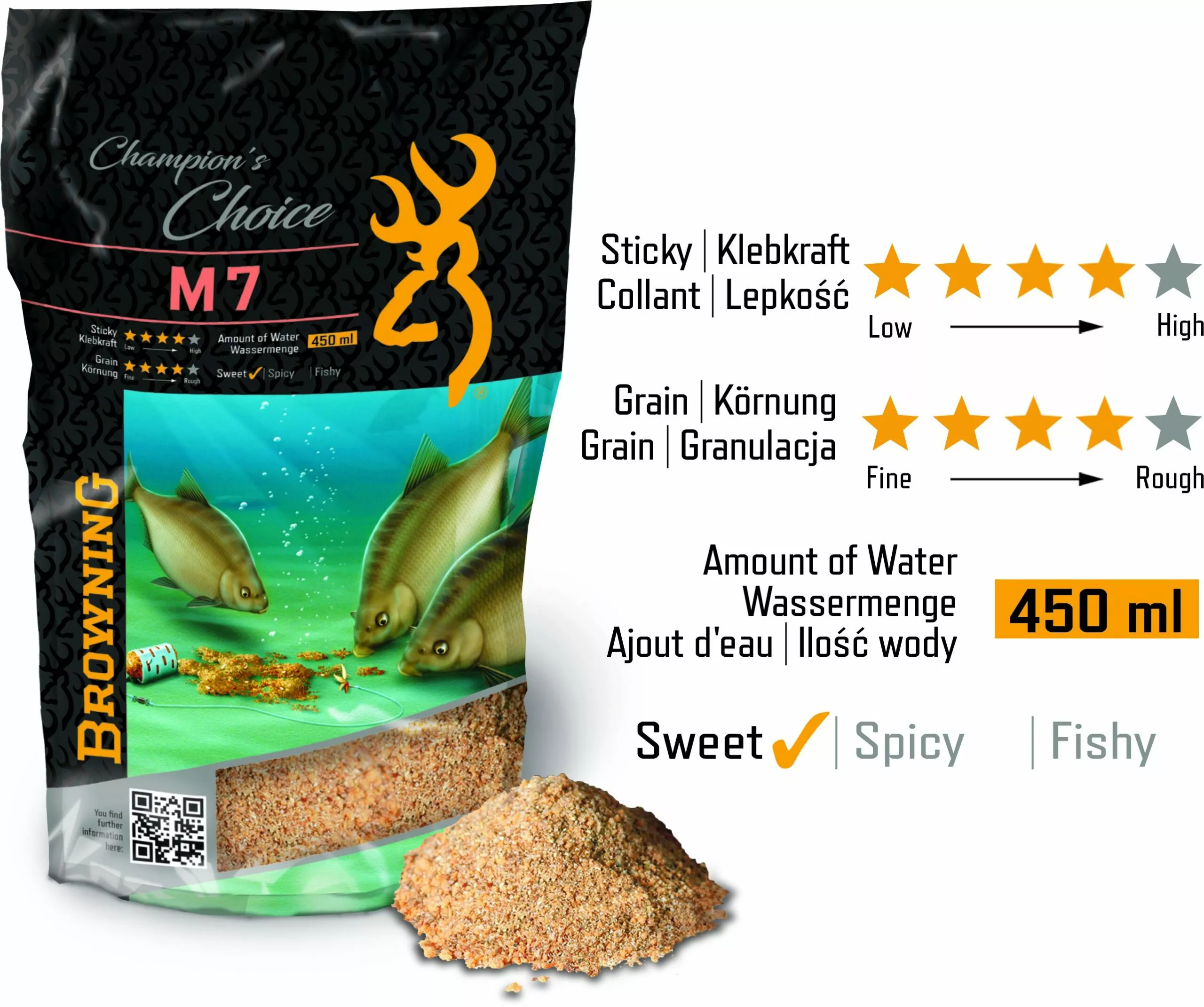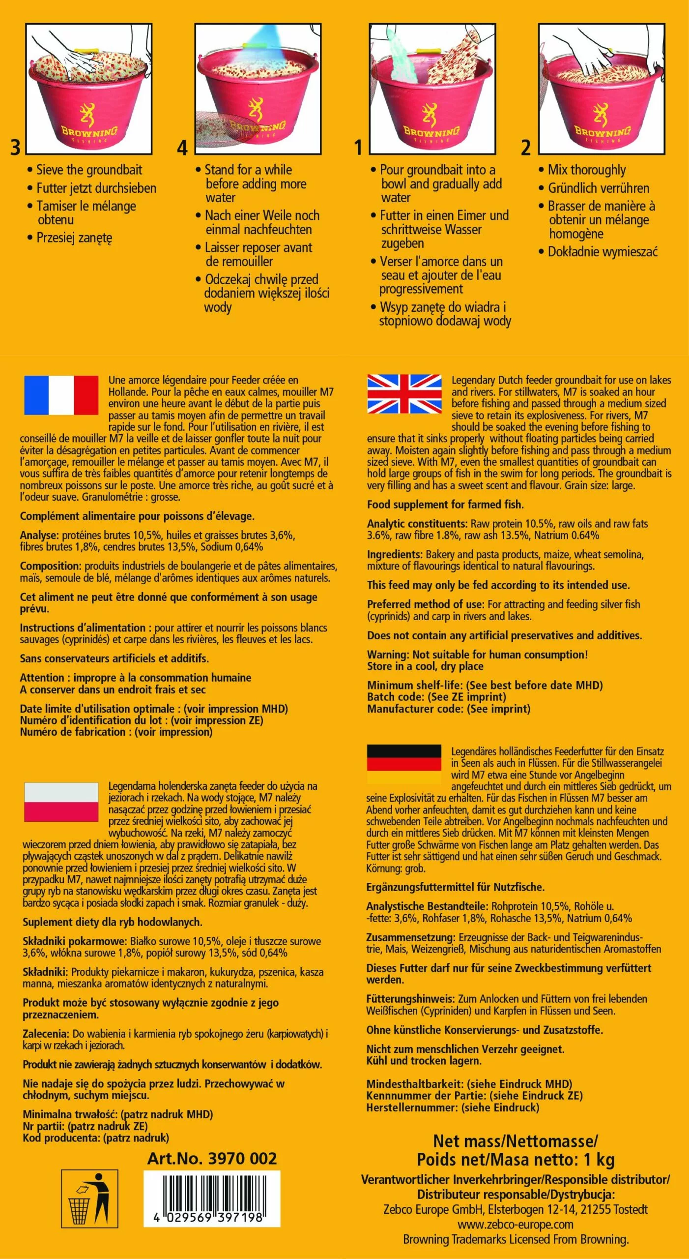 Het Legendarise Hollandse feedergrondvoer voor meren en rivieren. Als u M7 op stilstaand water gebruikt, kunt u het voer het beste een uur voor het vissen laten in weken en daarna door een zeef van mediumformaat halen om zo de explosiviteit ervan te behouden. Vist u op stromend water, dan raden wij u aan om M7 de avond ervoor al te laten weken zodat u er zeker van kunt zijn dat het goed zinkt, zonder dat kleine zwevende deeltjes wegstromen. Maak het voer net voor het vissen weer een beetje nat en duw het door een zeef van mediumformaat. Zelfs een hele kleine voerstek die met M7 werd aangelegd is in staat om grote scholen vis voor langere tijd in de buurt te houden. Het voer is erg verzadigend en heeft een zoete geur en smaak. Korrelgrootte: groot. Voor nadere informatie vind je op de zak een QR code die toegang geeft tot een video.