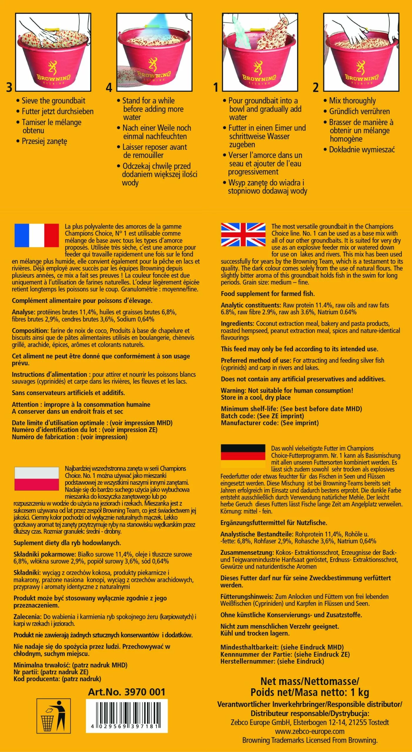 Het meest veelzijdige grondvoer in de Champions Choice lijn. No. 1 kan worden gebruikt als een basismix met al onze andere grondvoer. Het is geschikt om erg droog gebruikt te worden als explosieve feeder mix, maar kan ook vochtiger gemaakt worden voor het gebruik op meren en rivieren. Deze mix werd jarenlang met succes gebruikt door het Browning Team, en dat zegt natuurlijk heel wat. De donkere kleur komt uitsluitend voort uit het gebruik van natuurlijke meelsoorten. Het licht bittere aroma van dit voer houdt de vis lange tijd op de voerstek. Korrelgrootte: medium-fijn.