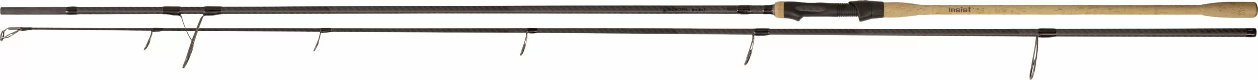 Een blikvanger met indrukwekkende kenmerken! De Insist hengels hebben een semi-parabolische actie met duidelijke krachtreserves. De actie wordt door een complete geweven carbonmat gestabiliseerd. De blank is niet geslepen om de volledige kracht van de materialen te behouden. De geleideogen van SeaGuide, waar de lijn niet achter kan blijven haken, passen perfect in het totaalbeeld van de hengel en bieden zekerheid bij de worp. Het 16 mm topoog levert ook bij het vissen in een woud van planten geen problemen op. De Fuji TVSTS molenhouder is geplaatst in een slanke, kurken handgreep. Ook een lijnclip mocht niet ontbreken. Alles bij elkaar is de hengel heerlijk licht en biedt ze zeer goede werpeigenschappen, zonder tijdens de dril te hard aan te voelen. Losschieters komen met deze actie van de hengel weinig voor. Het ontwerp van de hengel komt terughoudend en edel over – onopvallende graphics, merknaam in het kurk en een discrete buttcap met gravure.