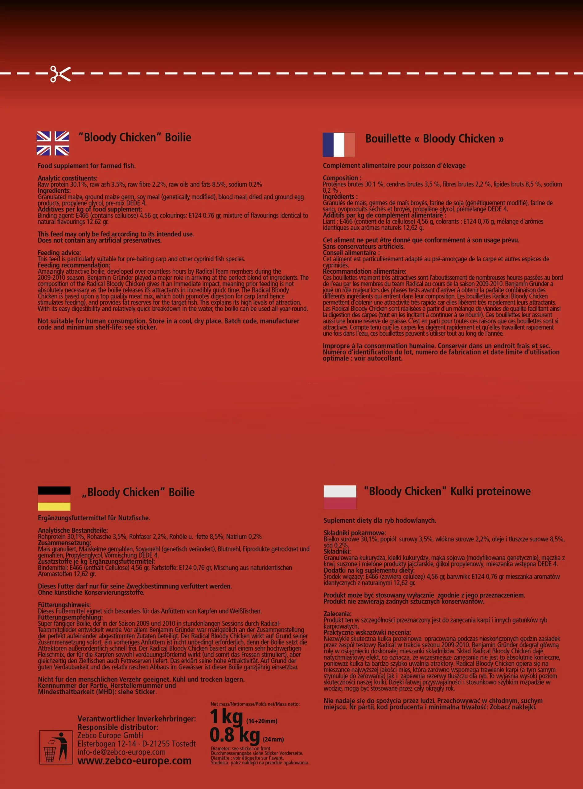 In deze “Radical Bloody amazing” boilies zitten ontelbaar veel testuren van leden van het Quantum Radical team tijdens het seizoen 2009-2010. De Duitse karperspecialist Benjamin Gründer nam daarbij het voortouw: hij kwam tot de perfecte mix om reusachtige Europese karpers te vangen. De ingrediënten van Radical Bloody Chicken hebben een instantwerking dankzij het feit dat de lokstoffen snel vrijkomen. Tests wezen uit dat grote vissen de vleesgeur meteen herkenden als voedsel en dat het niet nodig was om voor te voeren om vissen aan deze boilie te laten wennen. De Radical Bloody Chicken is gebaseerd op een vleesmix van topkwaliteit, wat de vertering én de eetlust ten goede komt. Daardoor is de aantrekkingskracht van dit aas fenomenaal. De boilie kan het hele jaar door worden ingezet en u kunt er genereus mee bijvoeren zonder het water te vervuilen, omdat hij snel verteerbaar is en relatief makkelijk uiteenvalt.