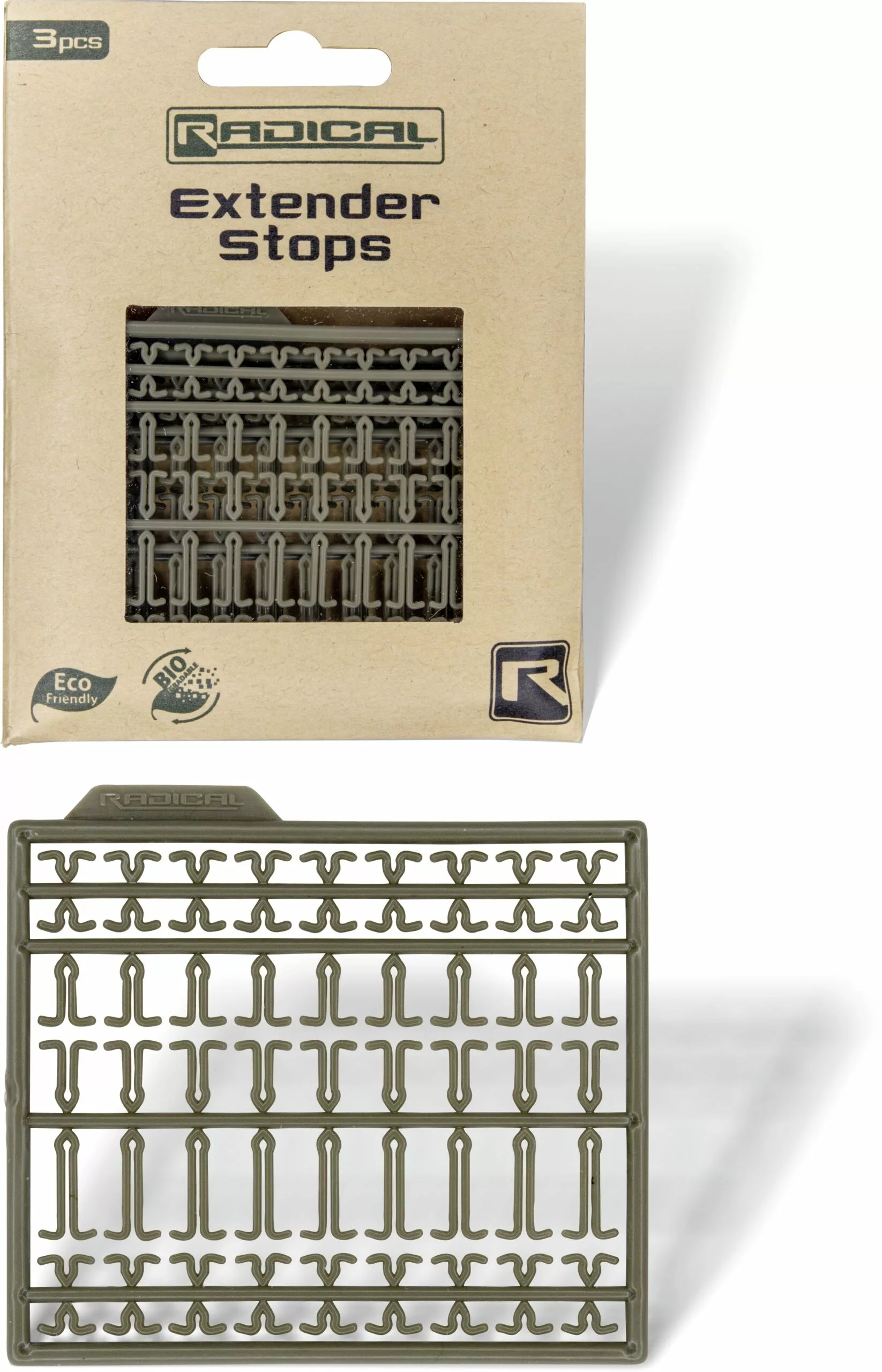 Stoppers in drie verschillende lengtes. Hiermee kan de lengte van de hair aangepast worden aan verschillende aassoorten. Het kunststof is biologisch afbreekbaar en heeft zo geen invloed op onze wateren.