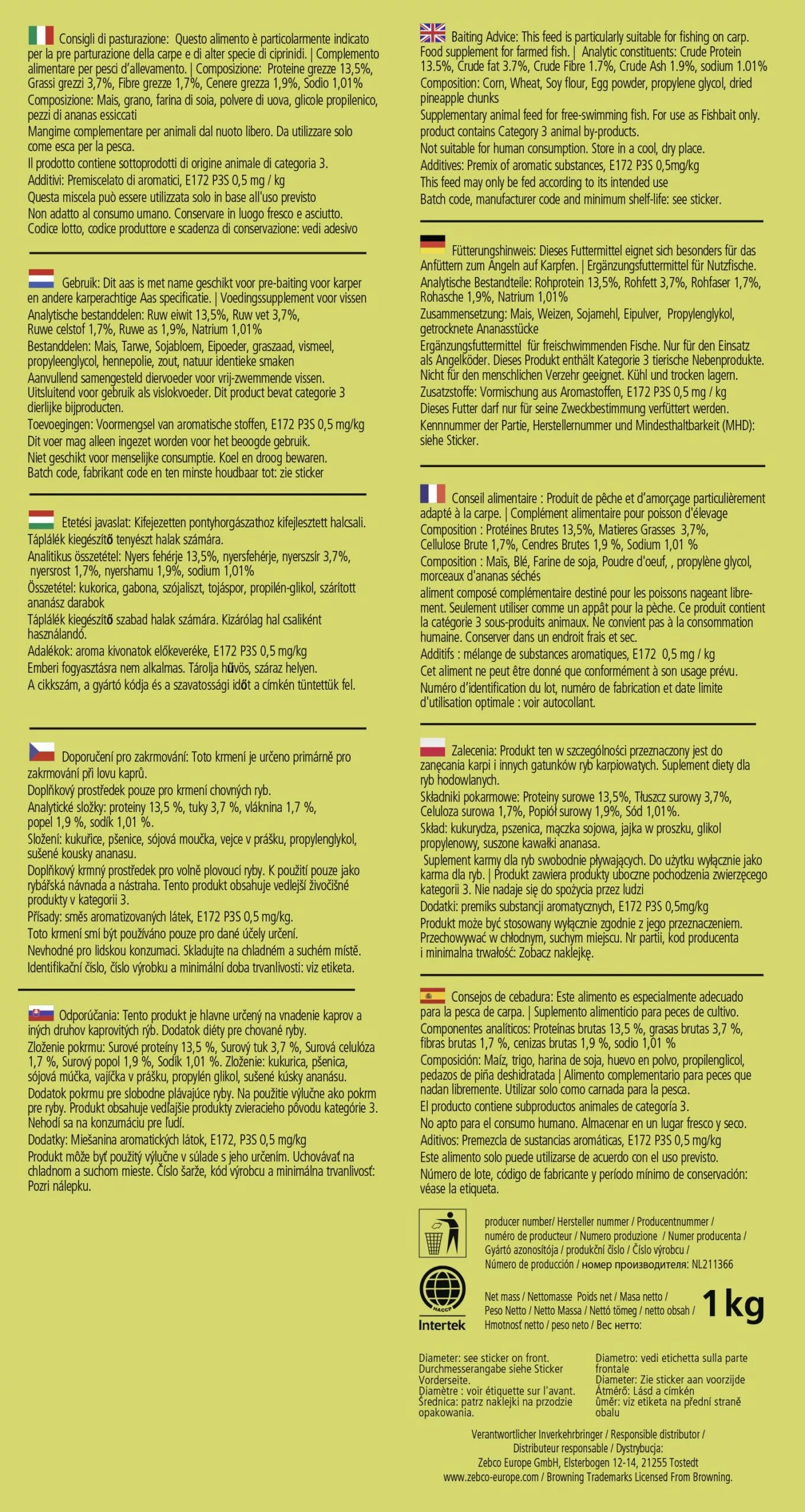 Wie kent haar niet, de ananasboilie? De receptuur van de Pineapple Zombie is al vele jaren onveranderd. Waarom? Eenvoudigweg omdat de boilie geweldig goed vangt en er geen redenen zijn om iets aan de boilie te veranderen. Maar wat maakt de Pineapple Zombie zo bijzonder? Het ligt aan de echte stukjes fruit in deze boilie. Wanneer je al eens van het toverwoord NHDC gehoord hebt, dan weet je dat het hierbij gaat om een natuurlijke zoetstof gaat, eentje die uit de bast van de ananas gewonnen wordt. Deze zoetstof is zo sterk en uniek zacht en vet van smaak, dat ze karpers compleet door laat draaien. Maar het zijn niet alleen de stukjes vrucht die de Pineapple Zombie haar ongelooflijke vangkracht verlenen. Er werd verder geheel afgezien van het gebruik van kunstmatige zoetstoffen, in plaats daarvan werd er zoete vruchtennectar verwerkt in de mix. Deze beide zaken maken de boilie al tot een echte hit. Om het concept van het aas nog verder te perfectioneren is de Pineapple Zombie ook nog eens geel gekleurd. Geel heeft al vele tientallen jaren een duidelijke aantrekkingskracht op de karper. Waarom dit het geval is, is nog niet duidelijk geworden, maar het geeft deze boilie garantie op potentieel vele superuren aan het water. Of je de boilies nu gebruikt om langdurig mee voor te voeren of om er instant mee te vissen, de Pineapple Zombie functioneert. Een onverslaanbare combinatie voor gebruik in de warmere maanden is het mengen met tijgernoten gebleken. Maar ook in de winter levert deze boilie prima resultaten op, omdat ze vele, in het water oplosbare bestanddelen bevat en ook bij lage watertemperaturen een uitstekende werking heeft. Een echte alleskunner!