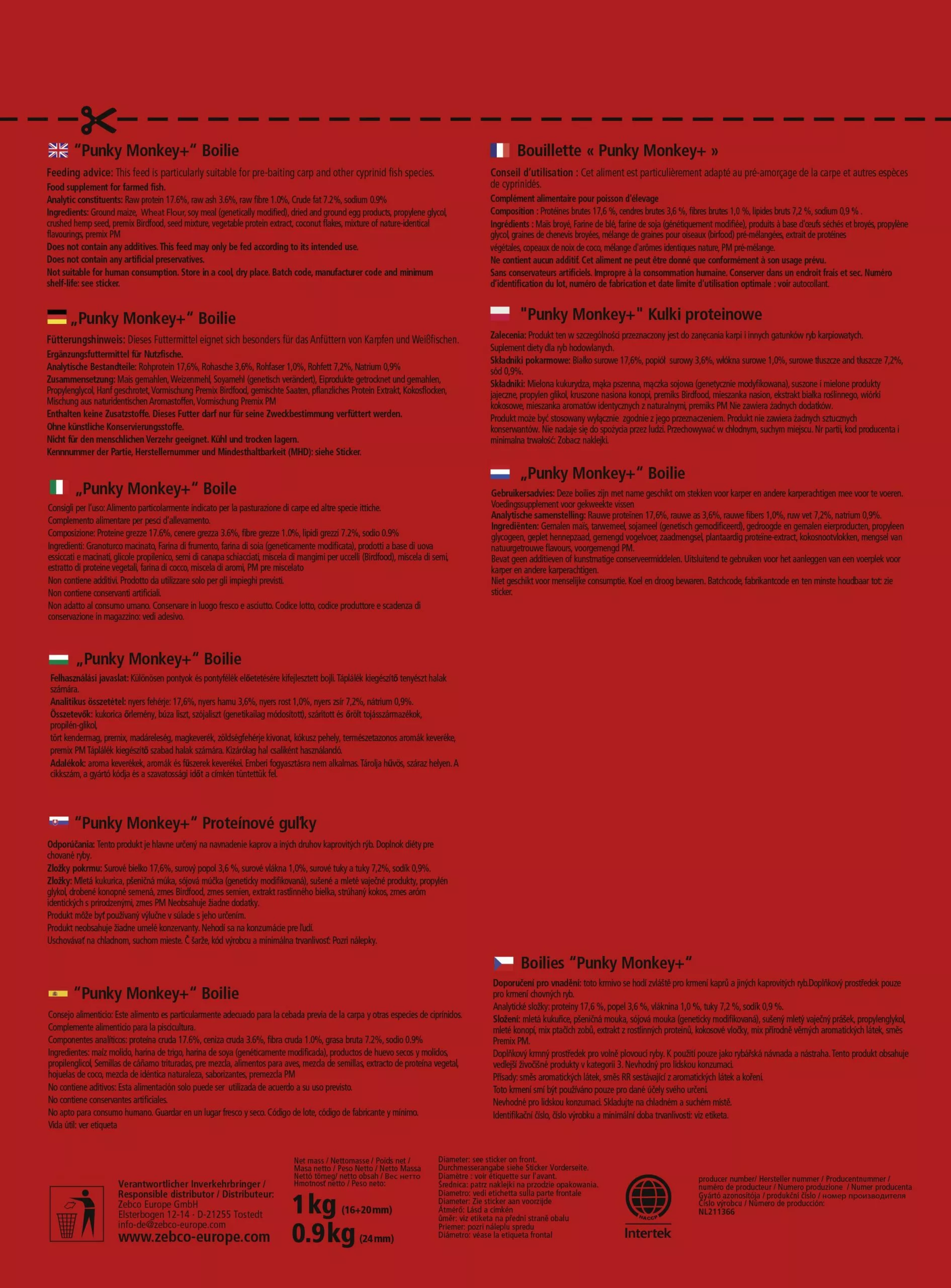 De Punky Monkey + is het resultaat van het systematisch verder ontwikkelen van onze welbekende fruitboilie gemaakt van bosaardbei en banaan, geproduceerd volgende de meest recente biologische bevindingen en voedselwetten. Het bevat stukjes gedroogde banaan en kruim van gemalen banaanboilies, wat het tot een onweerstaanbaar aas maakt voor de karper. Het zal zelfs schuwe vis verleiden onder zeer moeilijke omstandigheden!