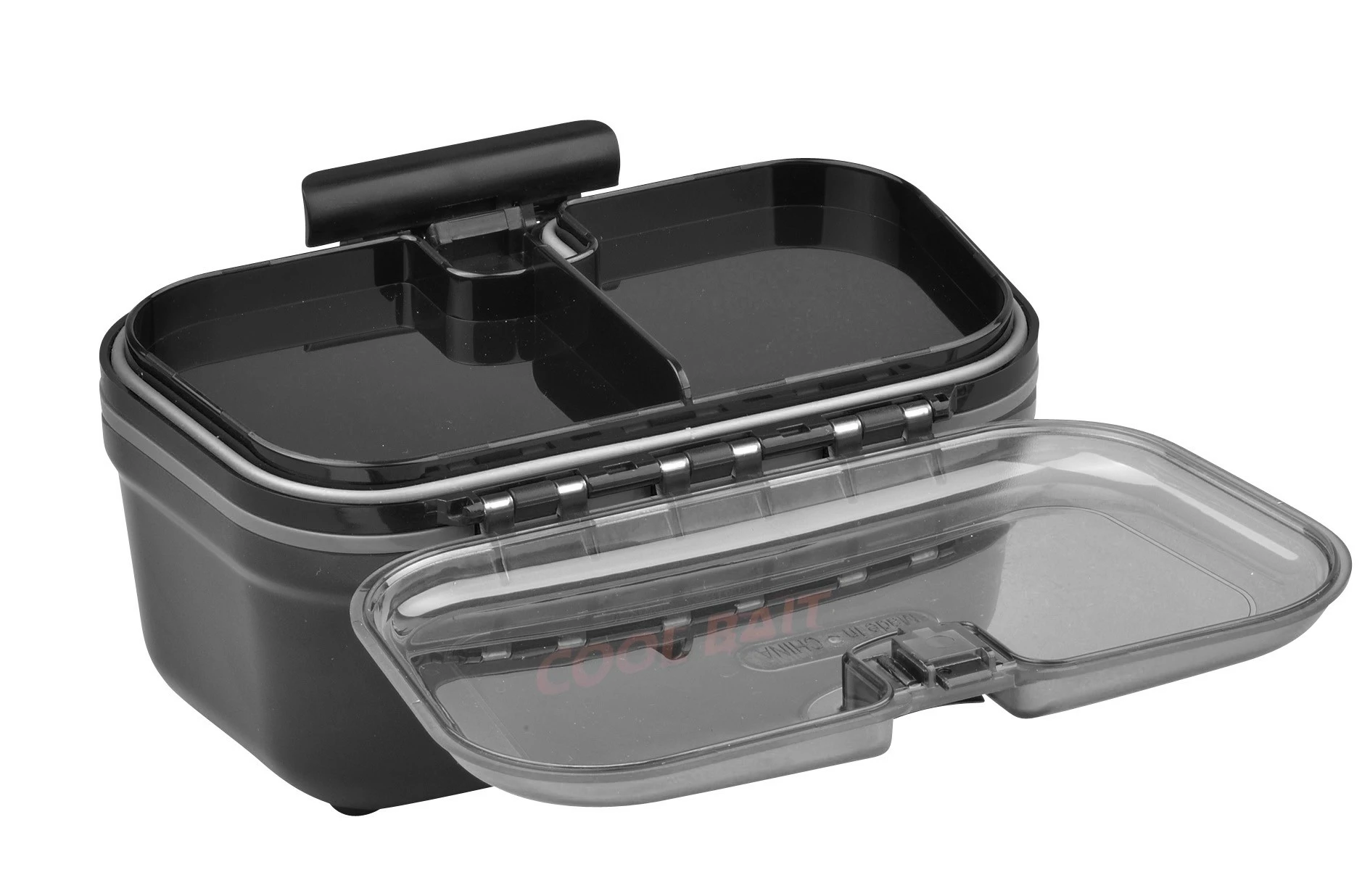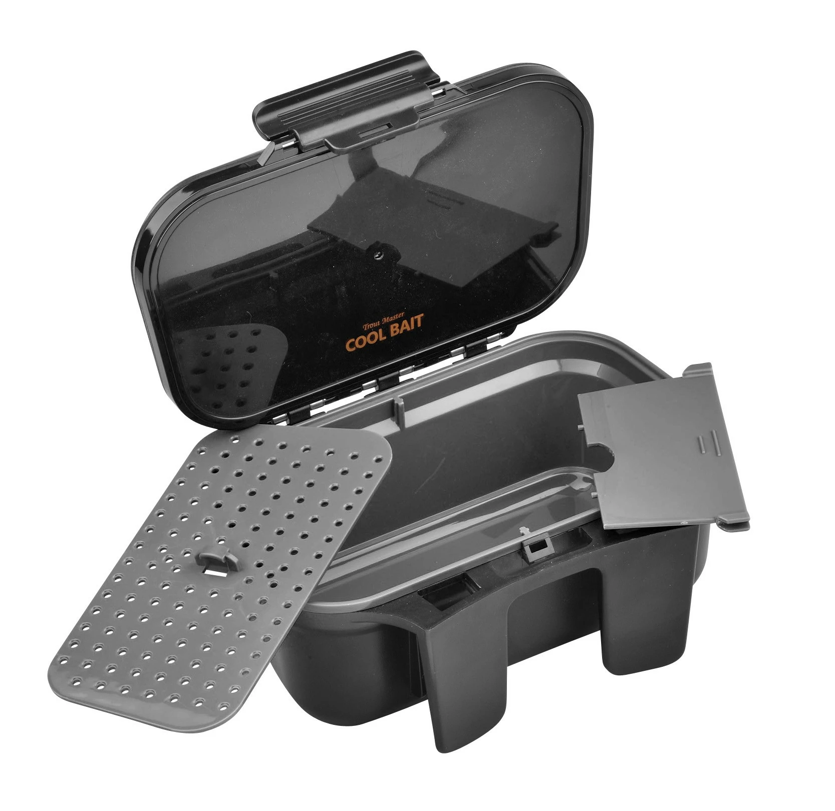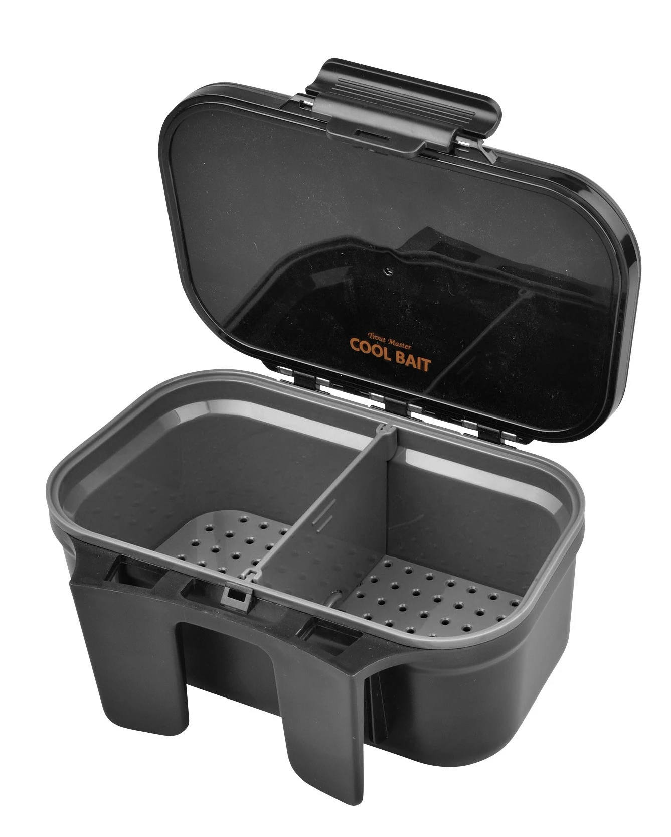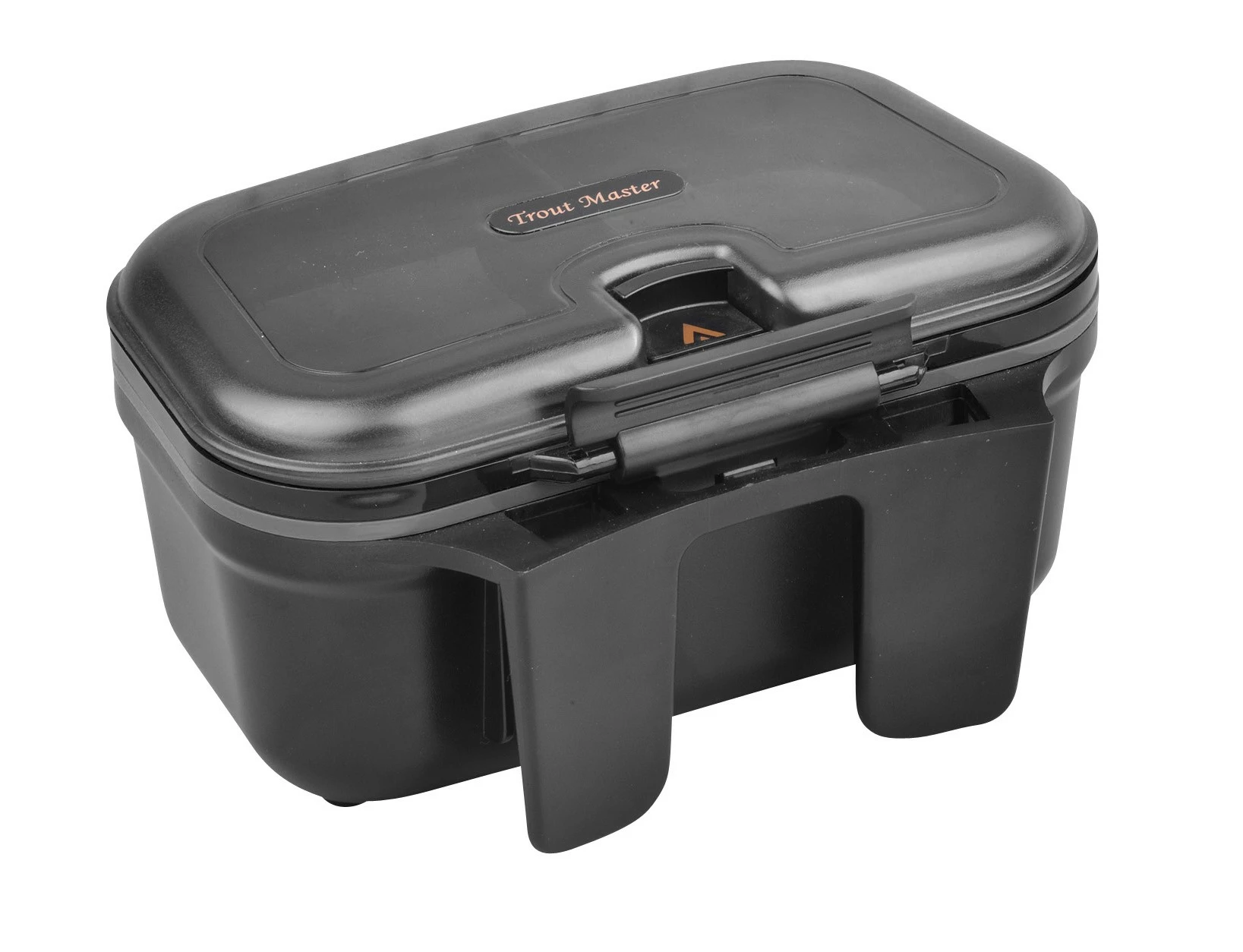 Met deze handige en degelijke “Bait Box” blijft je aas altijd vers bij de meest uiteenlopende temperaturen in zowel zomer als winter. De bovenkant is voorzien van een dubbel compartiment om bijvoorbeeld onderlijnenboekjes, wartels en ander klein materiaal op te bergen. De box is uitgevoerd met een “Belt Clip” voor bevestiging aan je broekriem. Praktisch bij het actief voeren en vissen op forel.