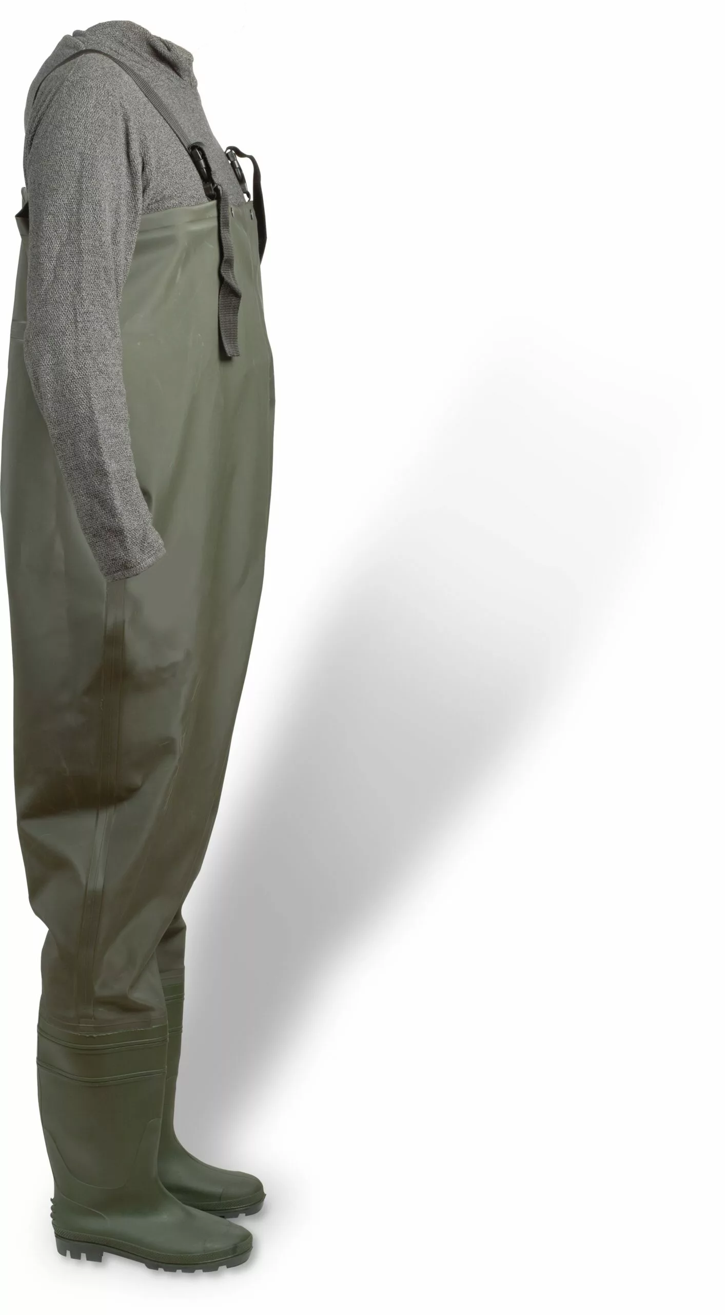Hoogwaardig PVC waadpak, alle naden zijn perfect afgewerkt, gegarandeerd absoluut waterdicht.